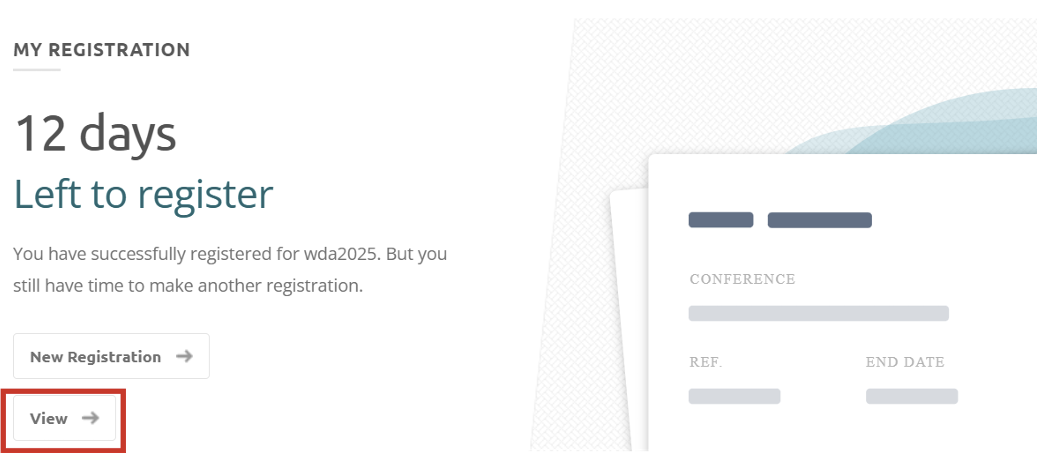 Scroll down to "My Registration" and click "View →" on the registration page on wda2025.exordo.com